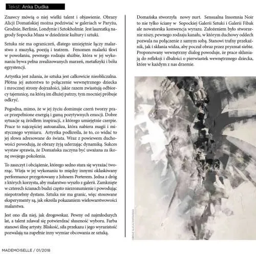 The abstract expressionism of Alicja Domanska seems to be like sleepy fantasies we would like to keep in mind. When we wake up already fly away. Alicja paint them and praise her for it.