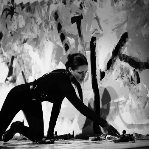 Domańska’s insubordinate style, and more specifically her almost exclusive reliance on the colour black, give her a unique place in the Polish Art scene. Her works echo a sense of the French master painter – Pierre Soulages, consistently dedicating her works to the colour black with accents of light sometimes with accents in a strong stroke of red or gold – leading the viewer to her light. Domańska manages with her bold strong charismatic strokes of black paint to swallow up light achieving a particular sense of depth. With the strong contrasting light in her works she succeeds in drawing the observer into the picture, inducing him to make a close and precise examination of the work by holding his gaze.